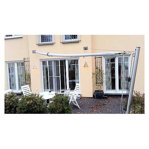 Hoe werkt het handmatig oprolbaar schaduwdoek? De techniek van een oprolbaar schaduwdoek is vergelijkbaar van een rolfok bij een zeilboot. We maken gebruik van het Sun FX-systeem die al jaren in de zeilsport wordt gebruikt en zeer sterk is gebleken. In het schaduwdoek is over een van de twee diagonale lijnen een tunnel gestikt waar de torsie lijn doorheen gaat. Deze diagonale lijn zit altijd strakgespannen tussen twee vaste punten. Dat kan tussen 2 muren of palen zijn of een combinatie daarvan. De zeer stevige torsie lijn is de as van het zonnedoek waard het materiaal omheen draait. Door aan een zijde van de constructie een soortement vliegwiel met trekkoord te monteren draai simpel het doek in of uit. Beide uiteinden van het zonnezeil span je d.m.v. een katrolsysteem strak. Wanneer het zeildoek ingerold is blijft er altijd een diagonale opgerold schaduwdoek zichtbaar hangen in de tuin. Afhankelijk van de afmeting van je doek is dat geen dikke rol, 15-20 cm meestal.