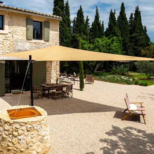 Materiaal: HDPE (extra stevig materiaal, speciaal ontworpen voor zonnedoeken) Gewicht: min. 340 g/m2 Dit schaduwdoek geeft minstens vijf jaar 95% – 97% bescherming tegen Uv-straling Type: Waterdoorlatend Weerbestendig, schimmelwerend en rot vrij