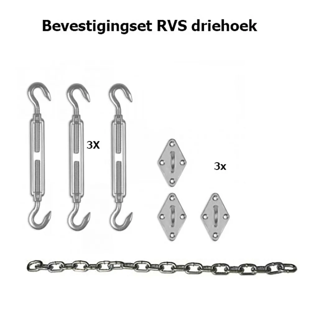 - Rvs bevestigingset: Deze set bestaat o.a. uit 3x een uitdraaispanner, 3x oogplaat, en ketting zoals je hieronder op de afbeelding kan zien. Dit is de meest gekozen optie en ook de eenvoudigste en snelste manier voor de bevestiging van een zonnedoek. Door het indraaien van de spanner wordt het spandoek strakgespannen.